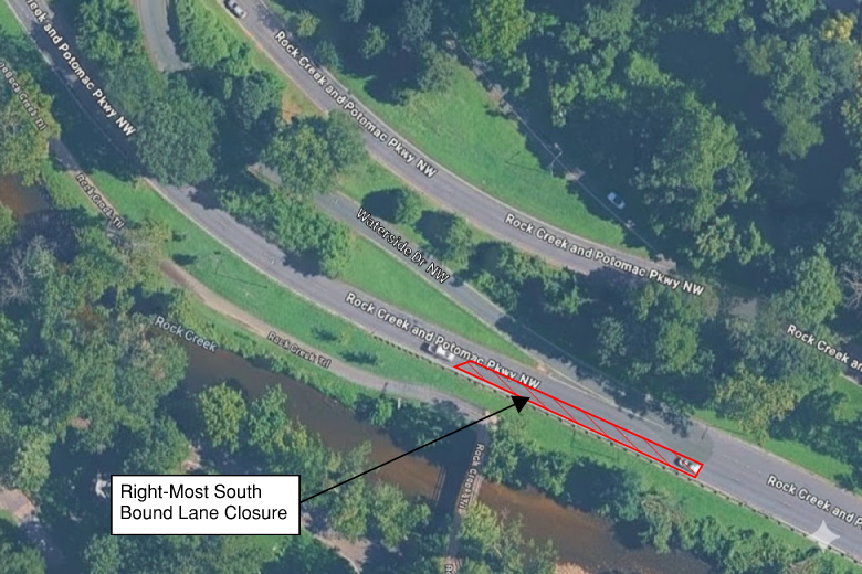 The temporary lane closure is expected to last for 2-3 hours on Friday, January 30, 2026 between the hours of 10 AM and 2 PM. Southbound lane of Rock Creek and Potomac Parkway near the ramp merge from Waterside Drive NW.